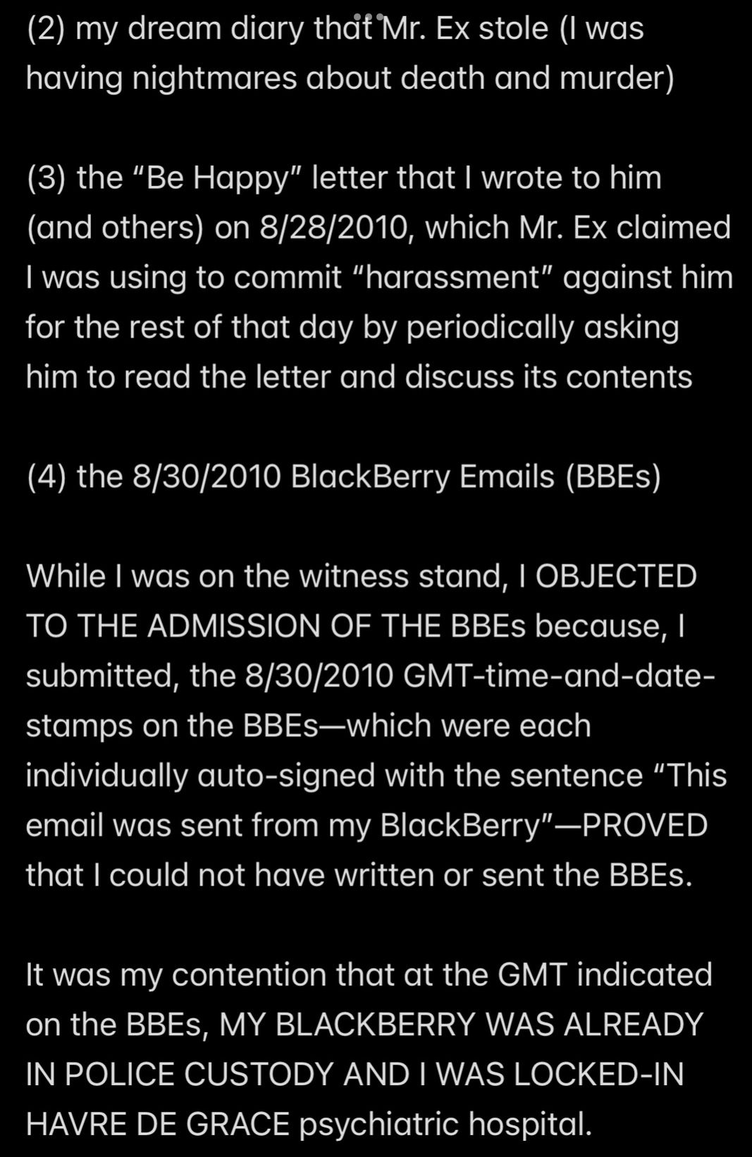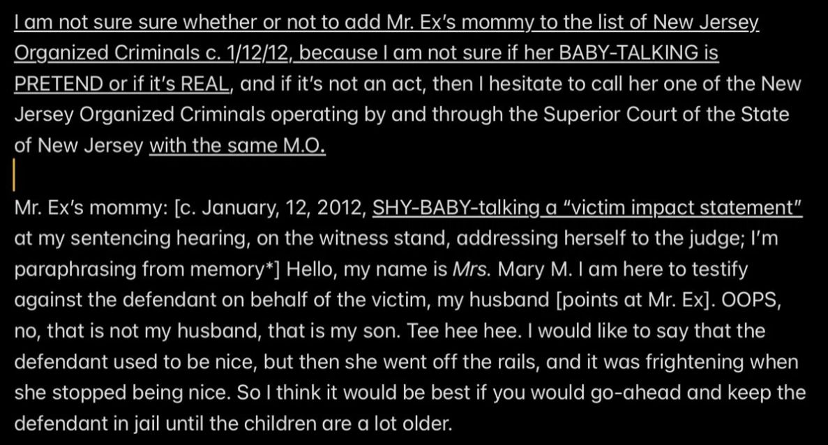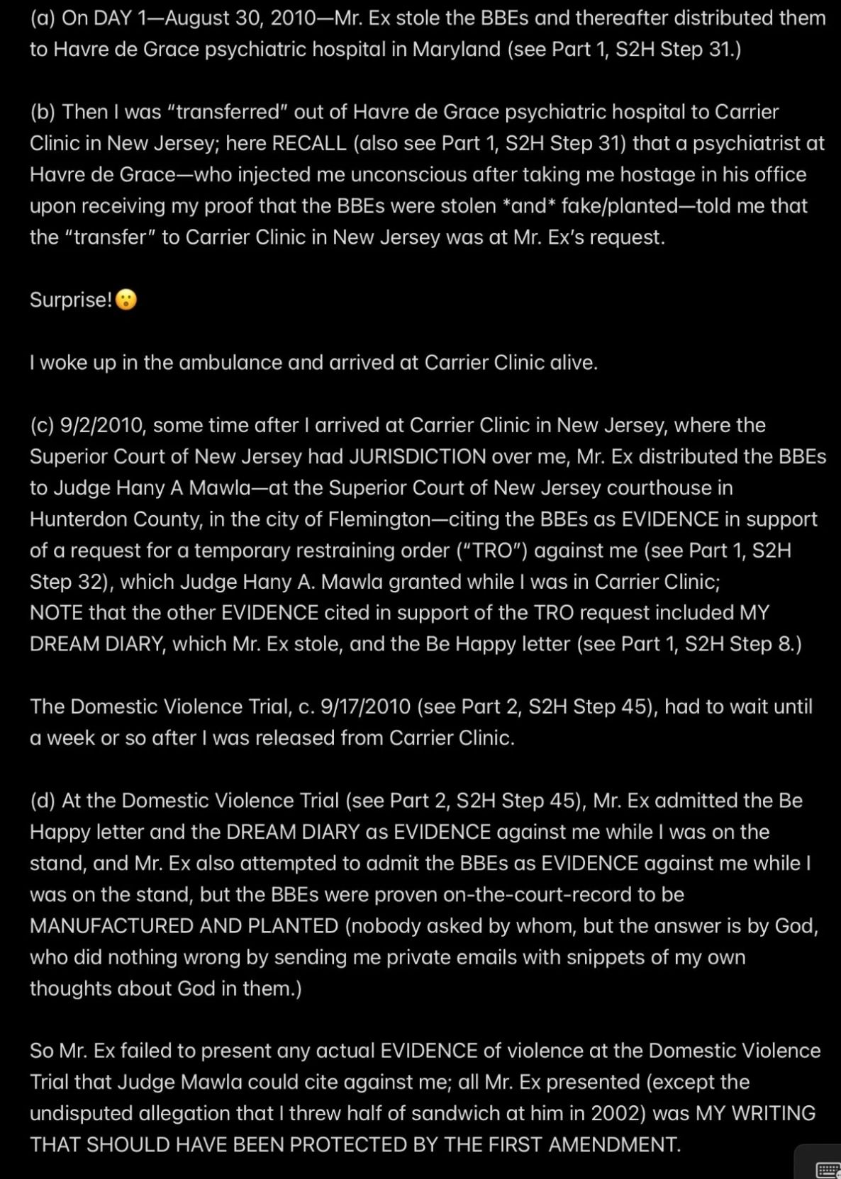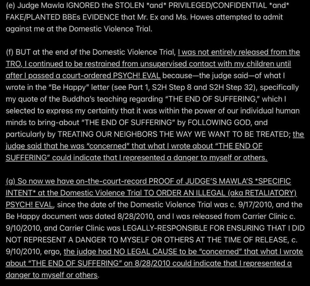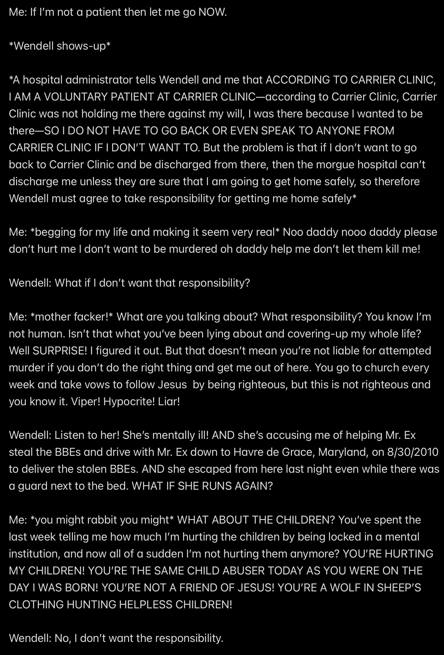 e.g., when Wendell was telling people in my “contacts list” (via email) that I had a “mental illness” that was causing me to FALSELY ACCUSE MR. EX MBA *AND WENDELL* OF ABUSE,
