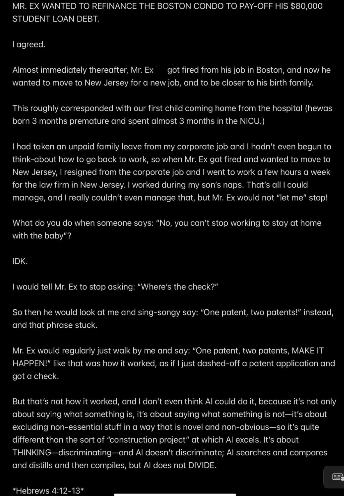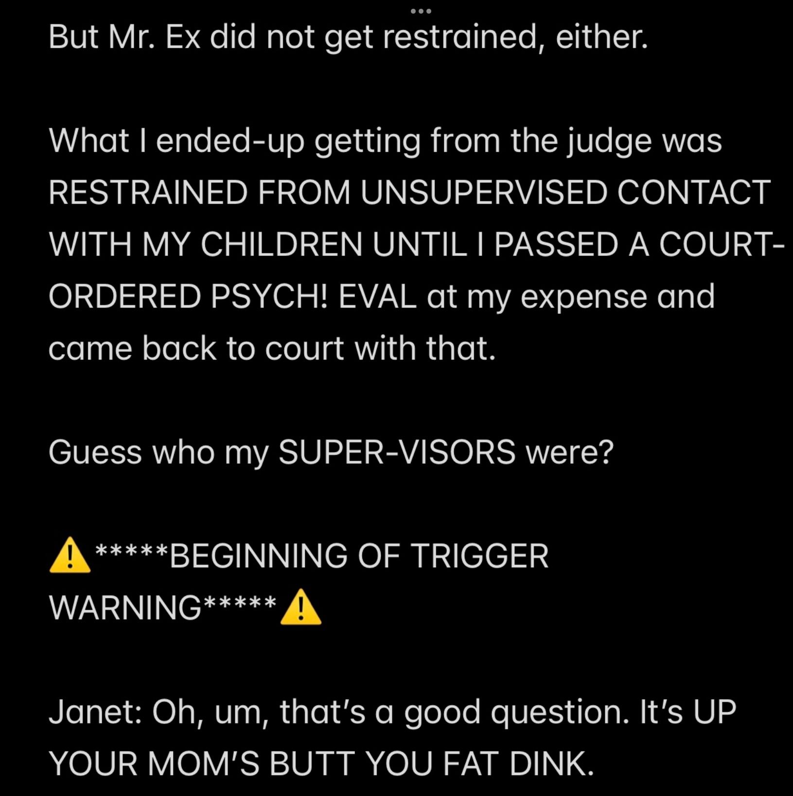 So the problem Wendell had was that WENDELL’S FALSE REPUTATION was going to suffer if the relatively WEALTHY Wendell was MORE ABUSIVE TO ME AS A FATHER than Mr. Ex MBA was to me as a husband!