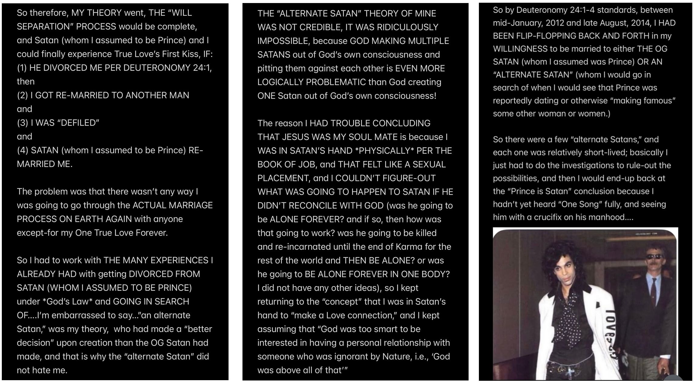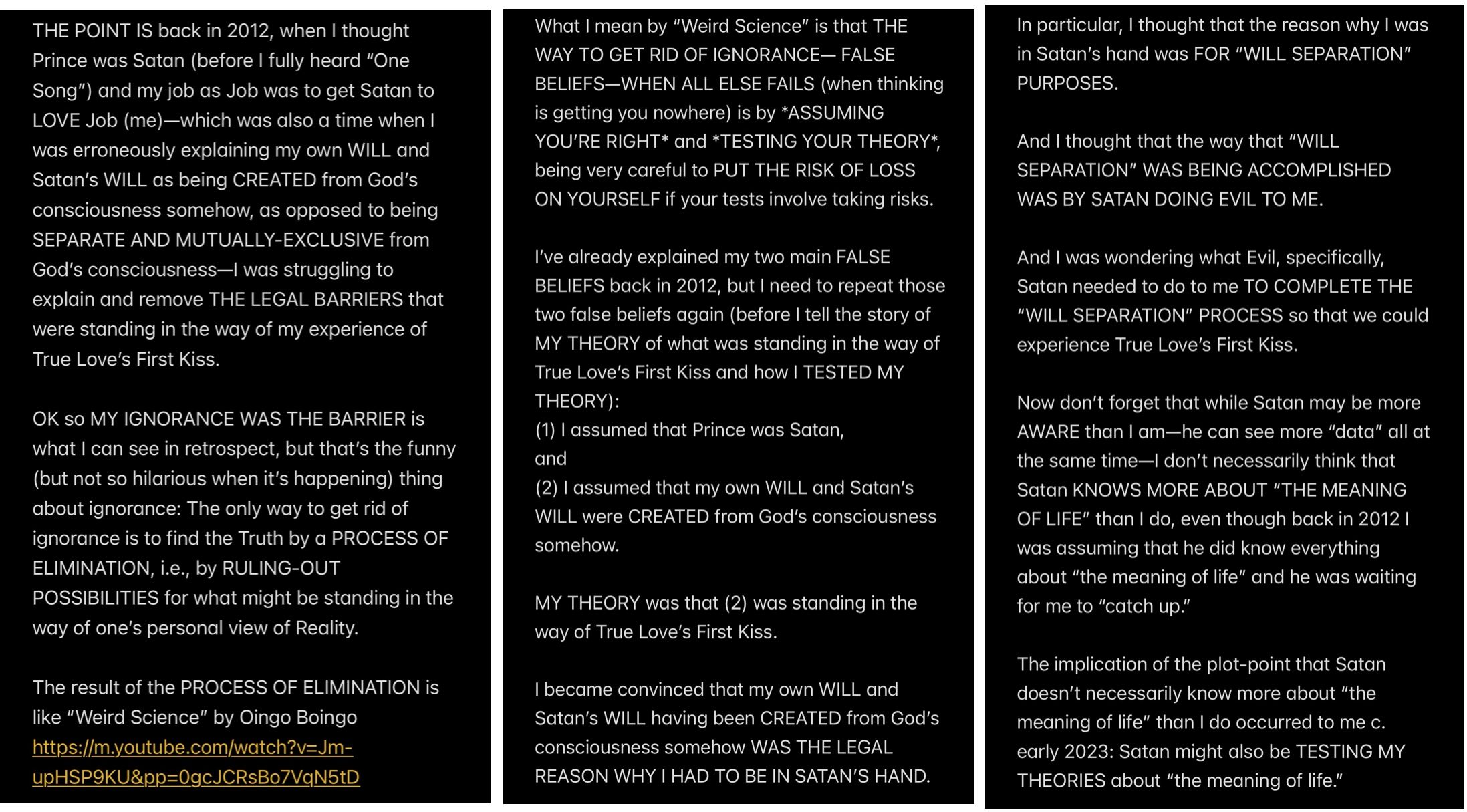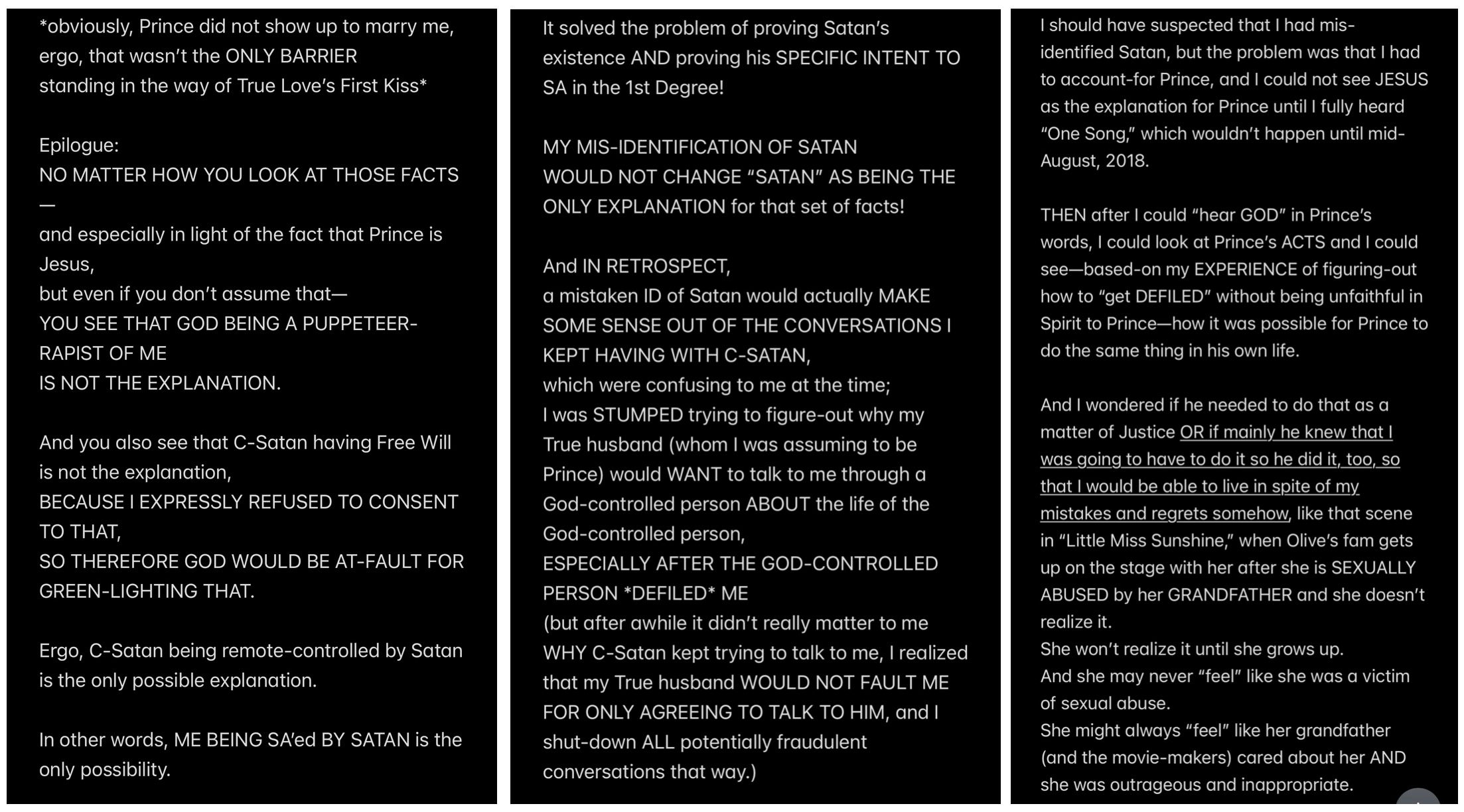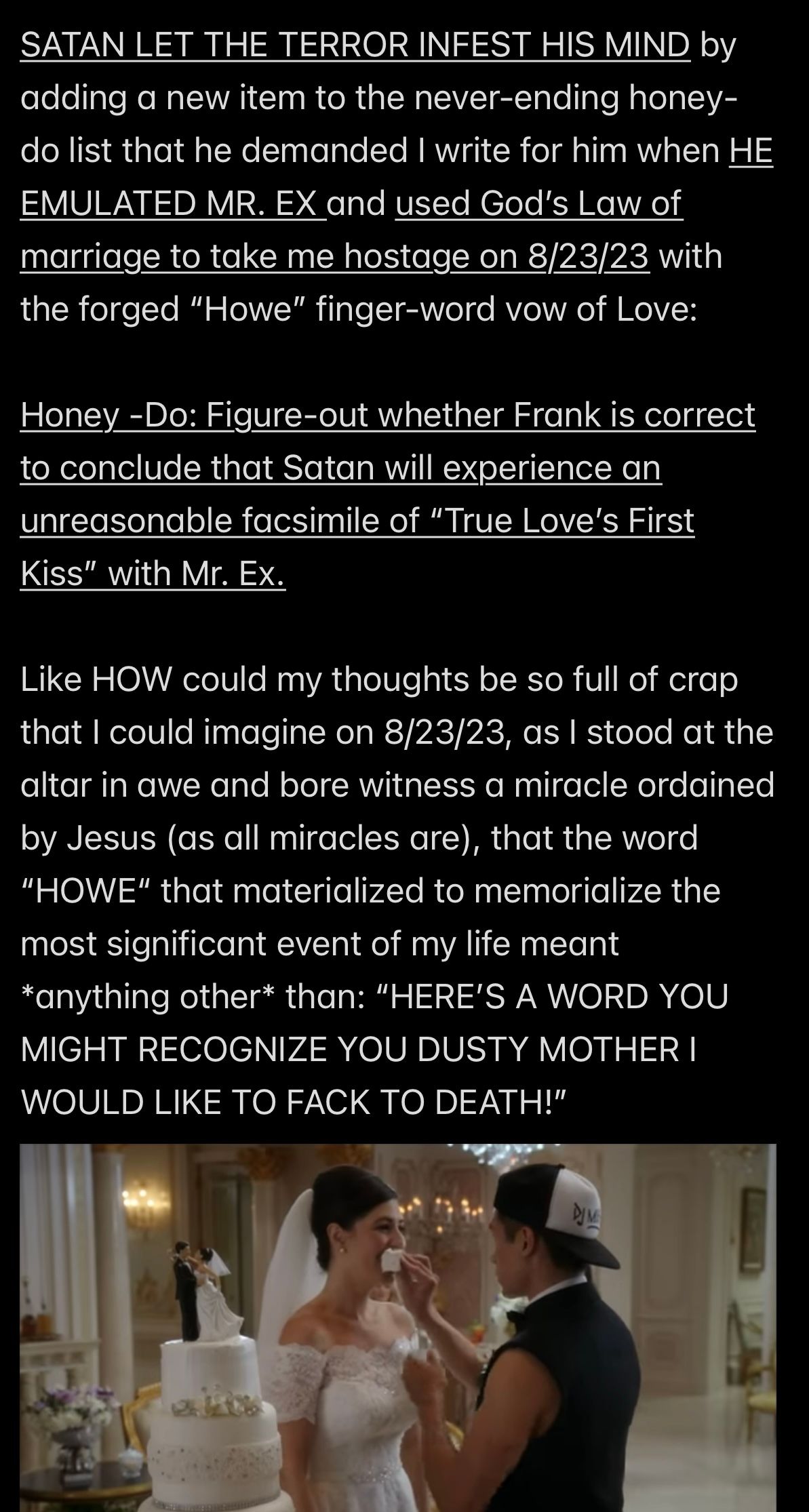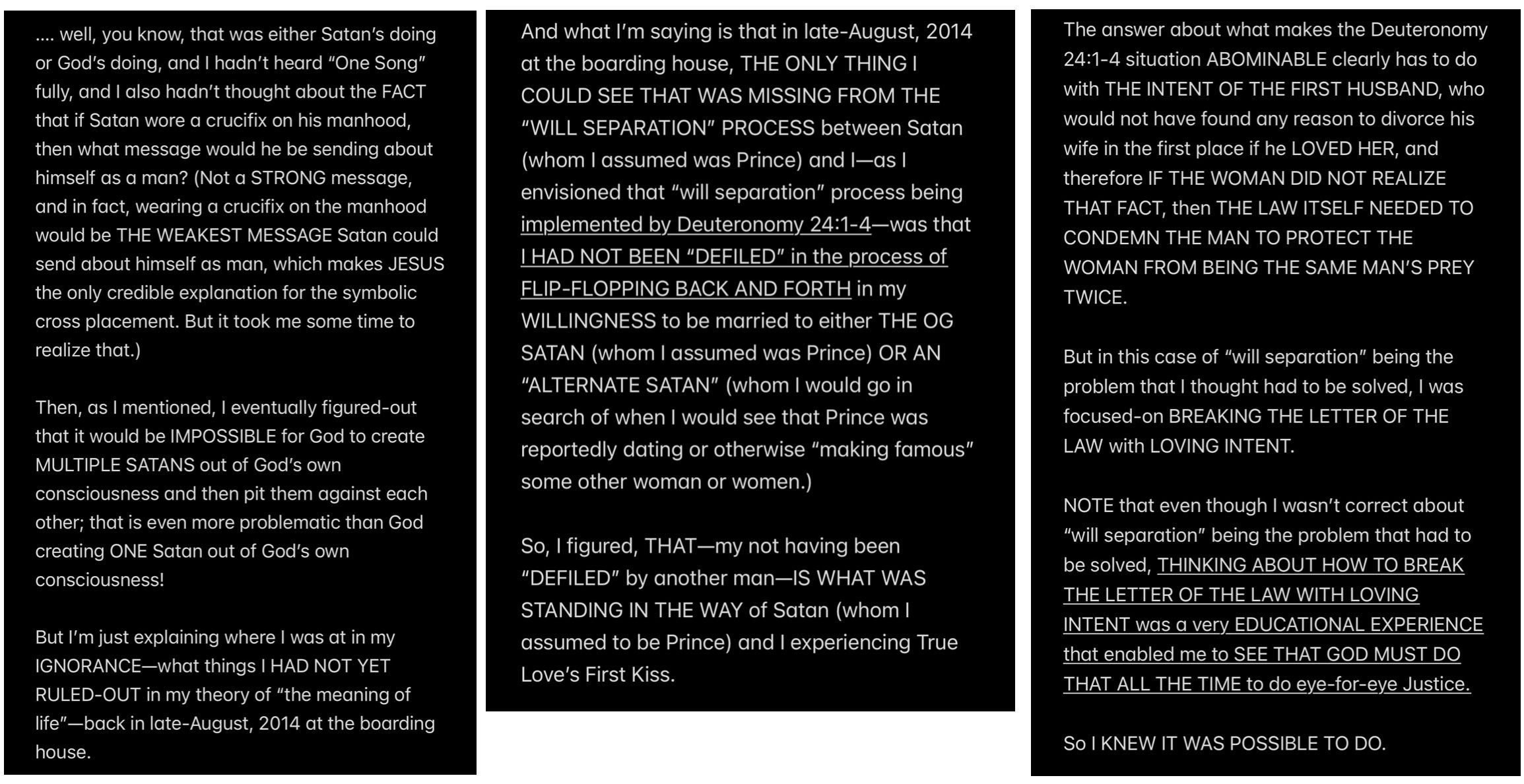 In retrospect, all of the analysis (other than the analysis of the “Howe” word event and “THE TEMPTATION OF SATAN” event) wasn’t even necessary to KNOW that Satan is my father, because to repeat THE UNDOUBTABLE TRUTH: IF SATAN CANNOT BE MY HUSBAND, THEN SATAN MUST BE MY FATHER.