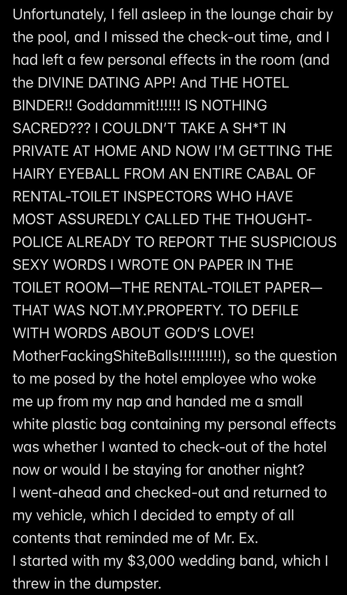 *and then* Wendell HYPOCRITICALLY OFFED the Whore of Babylon from the back of the beast and CONTINUED ON HIS *UNMARRIED* WAY,