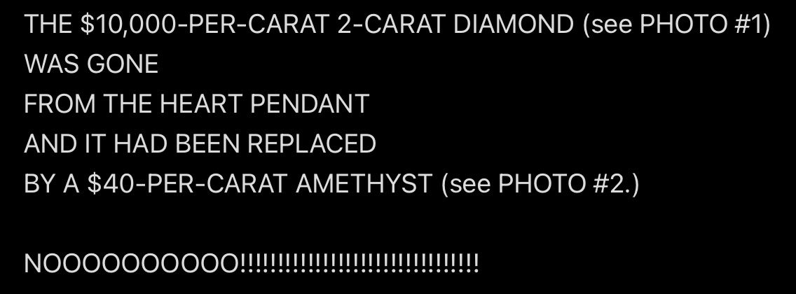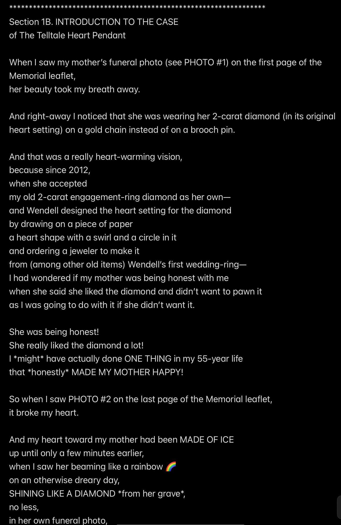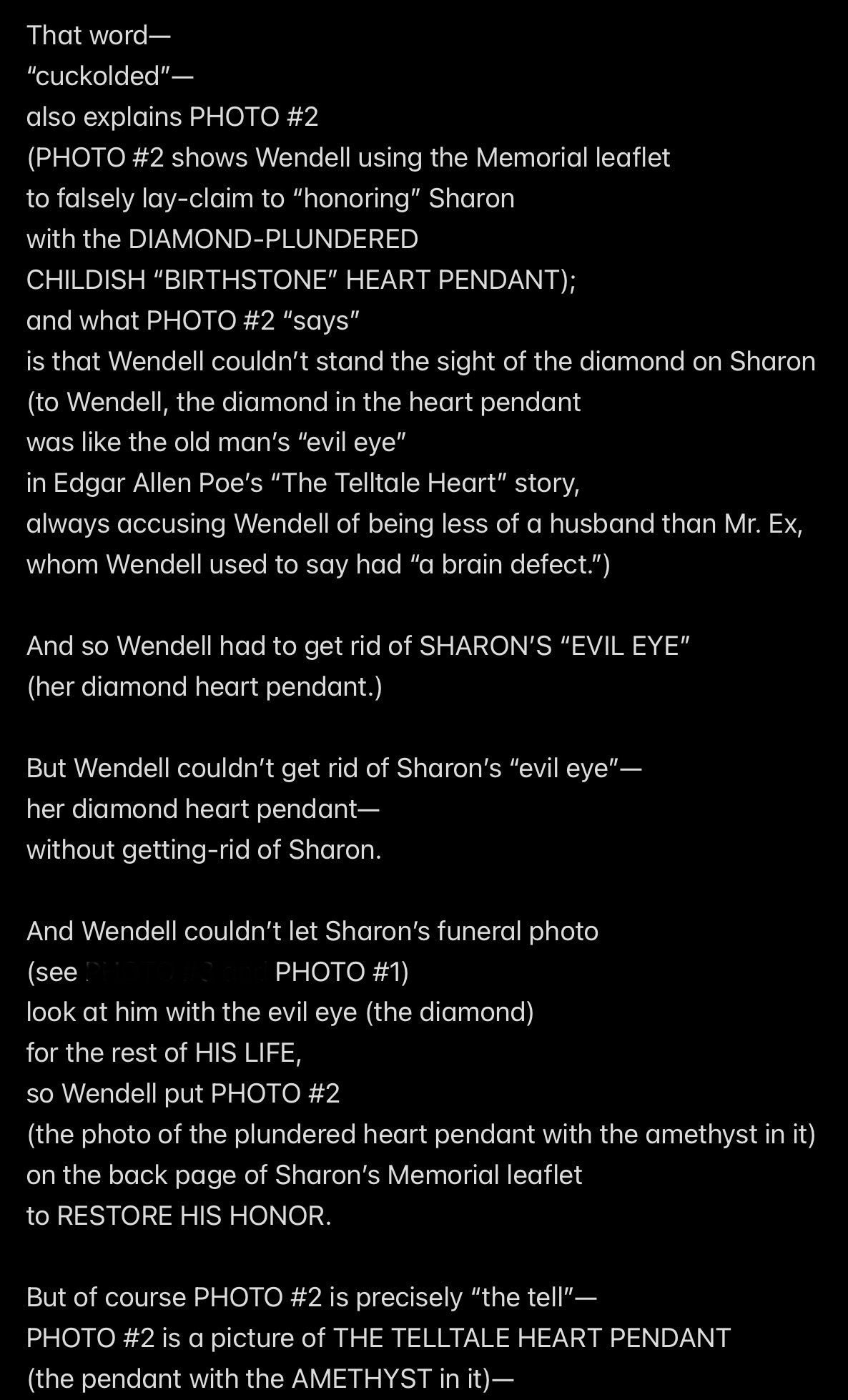 Sharon was sending a message ABOUT WENDELL by wearing Mr. Ex MBA’s diamond to her own funeral, and WENDELL HEARD THE MESSAGE, and WENDELL WAS WORRIED THAT EVERYONE ELSE WOULD HEAR SHARON’S HEART pendant AS LOUD AS HE DID, and so Wendell had to TRY TO KEEP SHARON’S HEART pendant QUIET (by plucking out the diamond), and that’s what GAVE HIM AWAY, exactly like what happened in “The Tell-Tale Heart” story by Edgar Allan Poe.