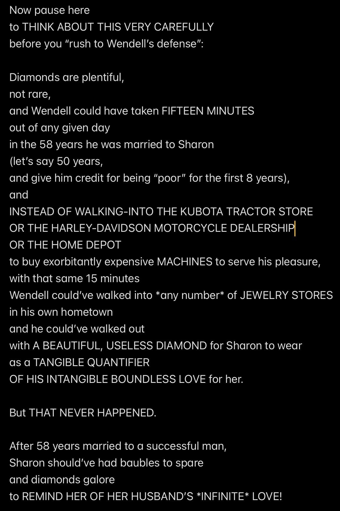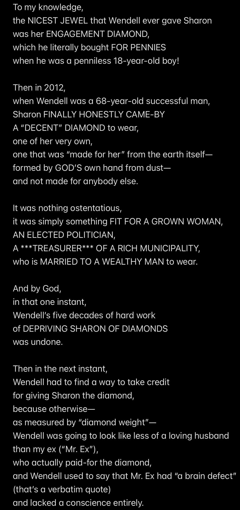 Turning to Wendell, we NOTICE that we have established CAUSE to suspect Wendell of murdering Sharon over Sharon’s choice of wearing Mr. Ex MBA’s DIAMOND, which is a CHOICE that effectively told the public: “I DO NOT LIKE WENDELL’S *TINY DIAMOND*, I LIKE MR. EX MBA’S *BIG DIAMOND*.” In other words, “FAT-WALLETED WENDELL IS LESS OF A HUSBAND THAN SLIM-WALLETED MR. EX MBA, WHOM WENDELL SAYS HAS A BRAIN DEFECT THAT REMOVED HIS CONSCIENCE.”