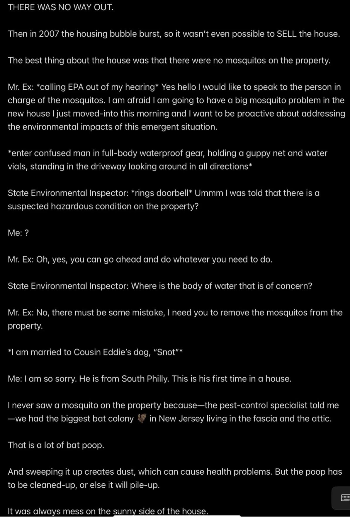 Mr. Ex. MBA, OTOH, would ask at family reunions whether or not his 10-year-old niece received the naked photos he sent (“What is wrong with you? I HAD TO USE A MAGNIFYING GLASS TO VERIFY THAT I WAS REALLY SEEING WHAT I THOUGHT I WAS SEEING IN THOSE PHOTOGRAPHS!”) and talk about his bowel movements and his sperm count.