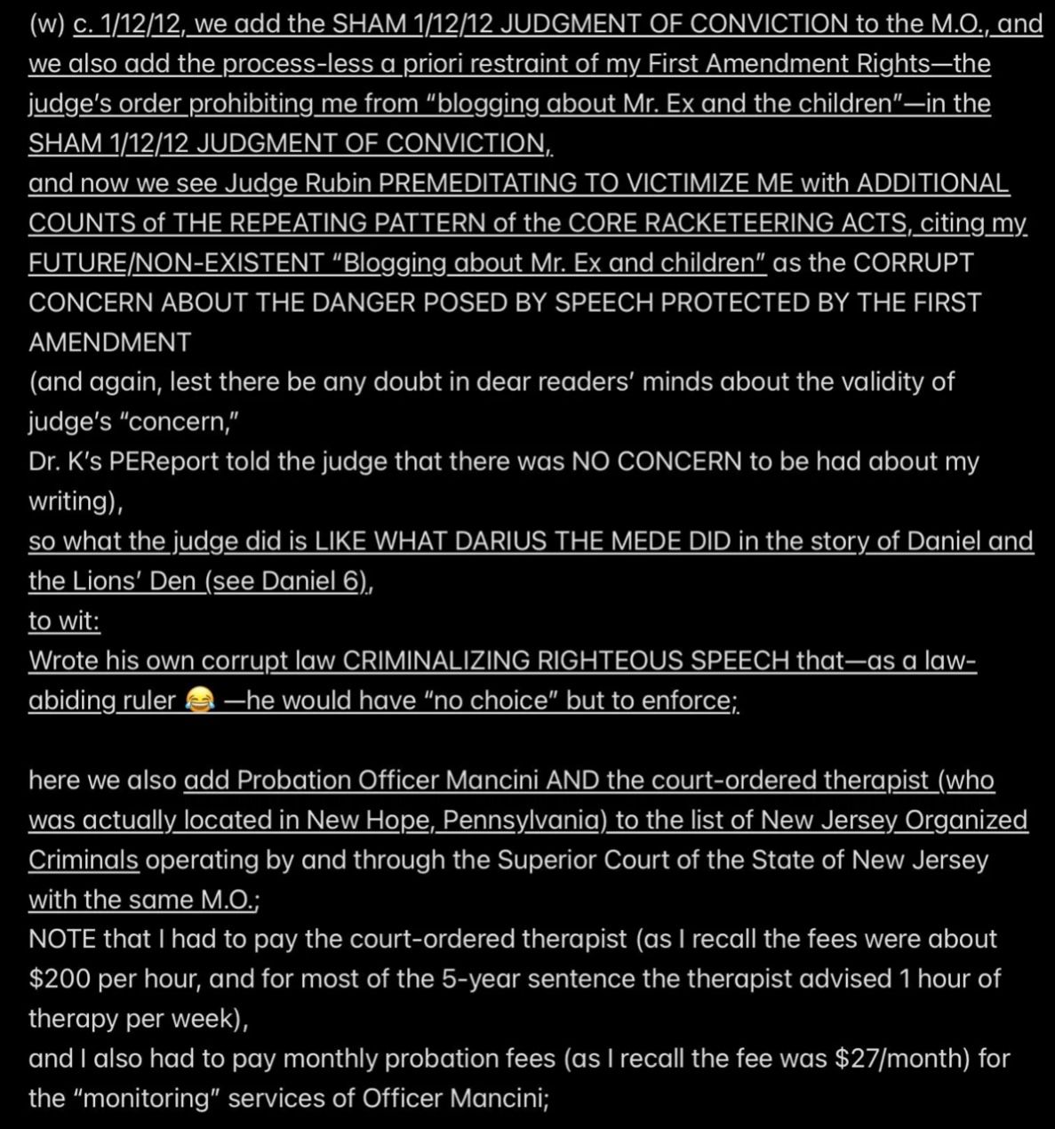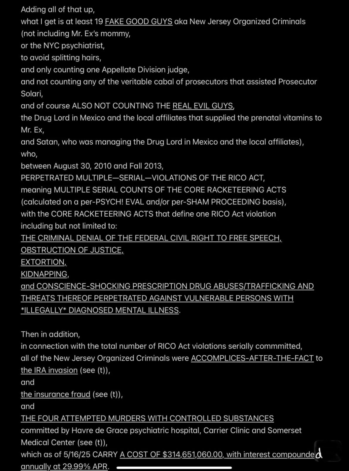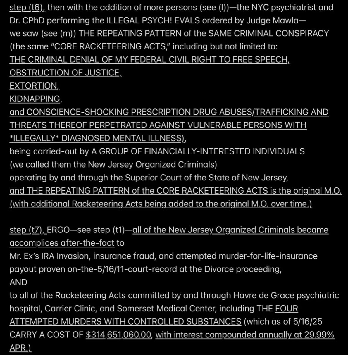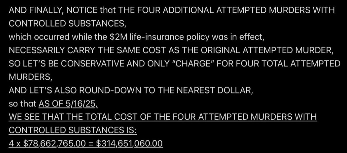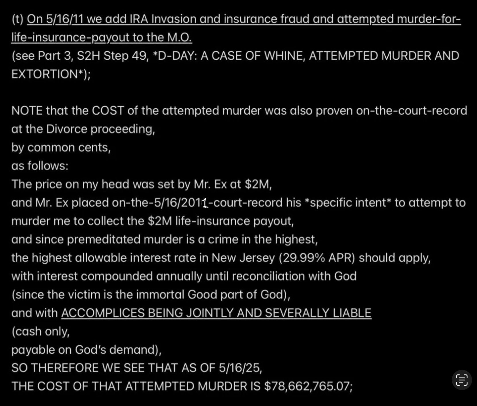 But because JESUS DID NOT REALLY INVOKE THE BET—SATAN WAS EX’ed—Satan and Mr. Ex MBA and their accomplices became jointly and severally FINANCIALLY LIABLE TO JESUS when I was murdered (at least four times a few days after the prenatal vitamins were delivered from Mexico into the Rainbow Hill House garage), and now they are all obligated to PAY (with interest at 29.99% APR, the highest allowable rate in New Jersey) THE $2M “PRICE ON MY HEAD” THAT MR. EX MBA SET WITH THE PROVEN-ON-THE-D-DAY-5/16/2011-COURT-RECORD *SPECIFIC INTENT* TO MURDER ME FOR THE $2M TERM LIFE-INSURANCE PAYOUT, with the presumed plan being to use the life-insurance proceeds to pay the Drug Lord in Mexico for manufacturing and delivering the prenatal vitamins.