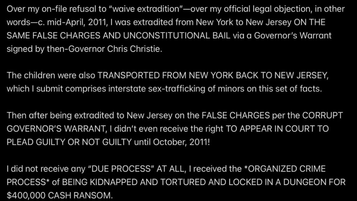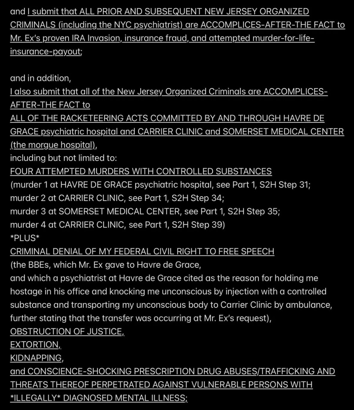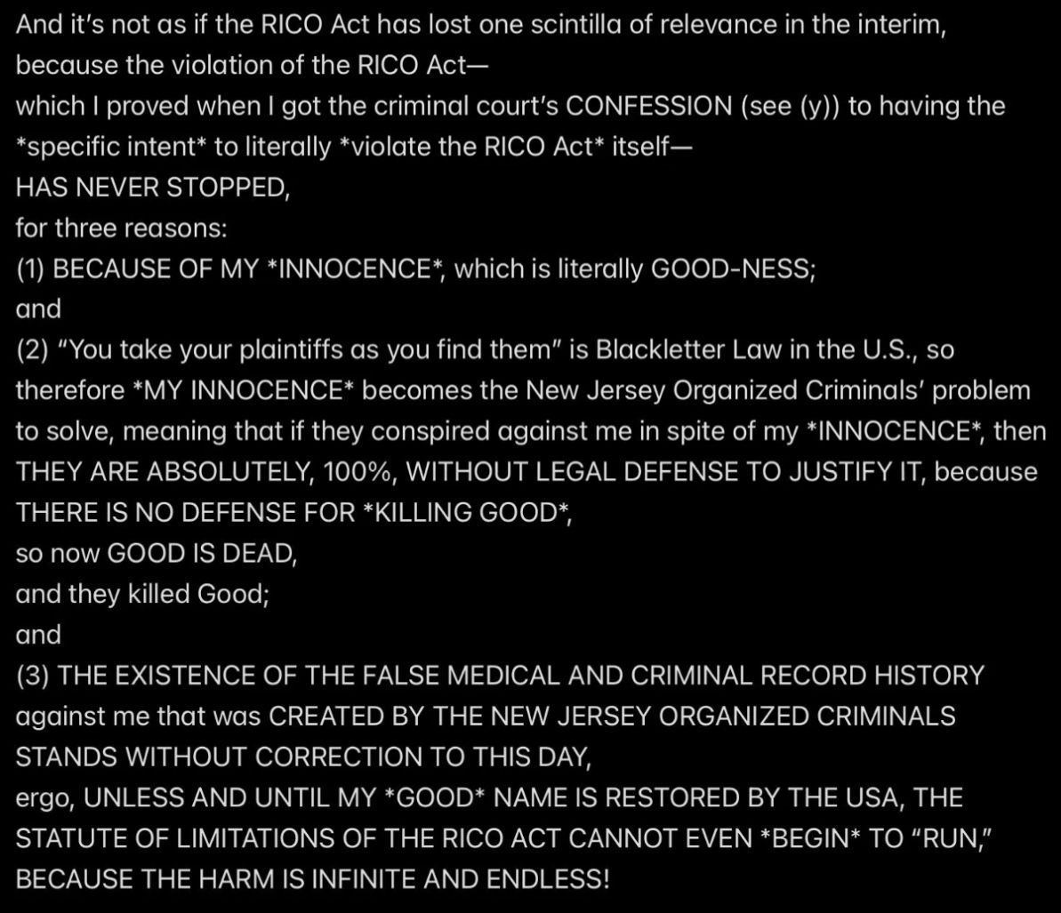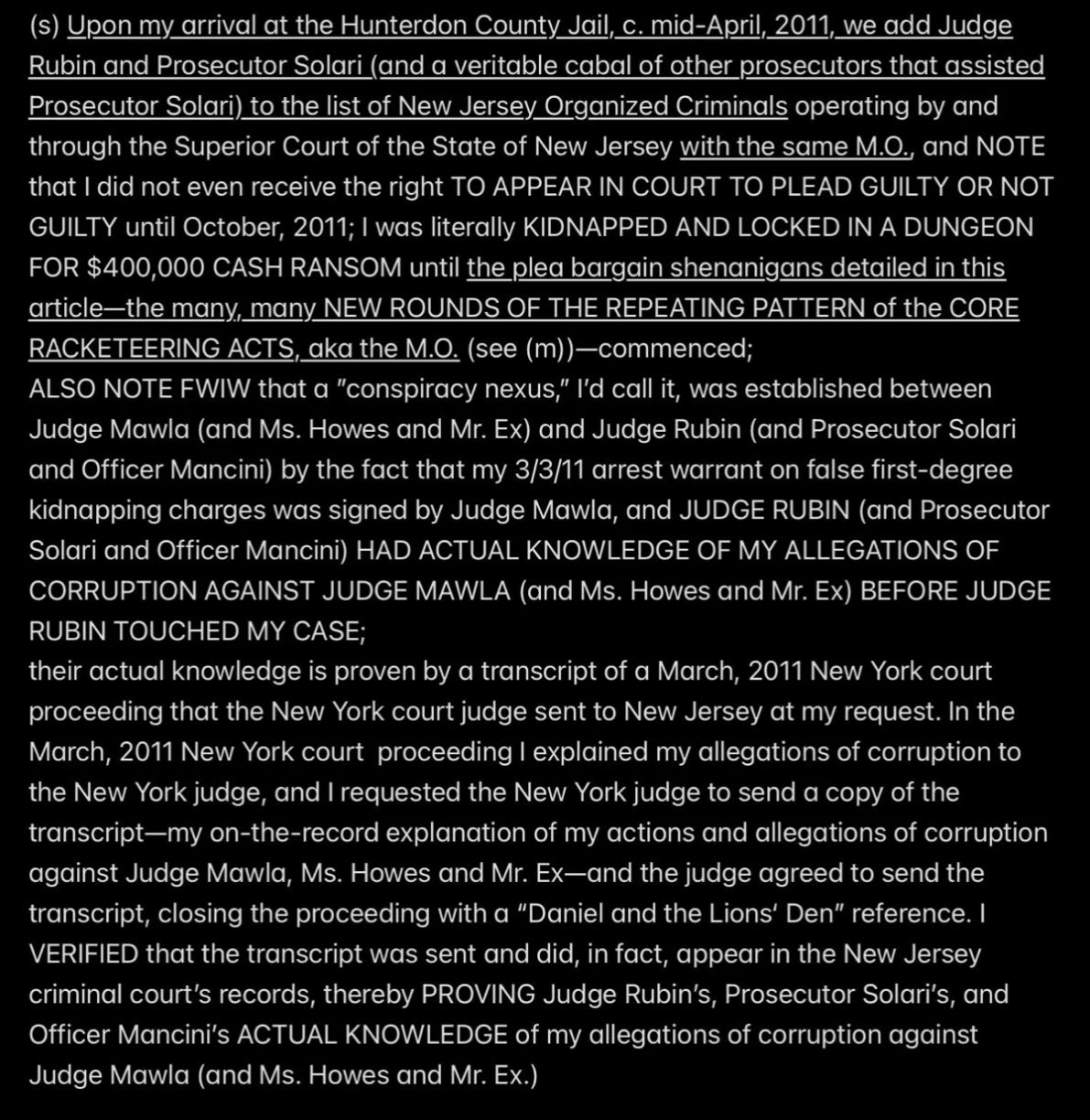 But because JESUS DID NOT REALLY INVOKE THE BET—SATAN WAS EX’ed—Satan and Mr. Ex MBA and their accomplices became jointly and severally FINANCIALLY LIABLE TO JESUS when I was murdered (at least four times a few days after the prenatal vitamins were delivered from Mexico into the Rainbow Hill House garage), and now they are all obligated to PAY (with interest at 29.99% APR, the highest allowable rate in New Jersey) THE $2M “PRICE ON MY HEAD” THAT MR. EX MBA SET WITH THE PROVEN-ON-THE-D-DAY-5/16/2011-COURT-RECORD *SPECIFIC INTENT* TO MURDER ME FOR THE $2M TERM LIFE-INSURANCE PAYOUT, with the presumed plan being to use the life-insurance proceeds to pay the Drug Lord in Mexico for manufacturing and delivering the prenatal vitamins.