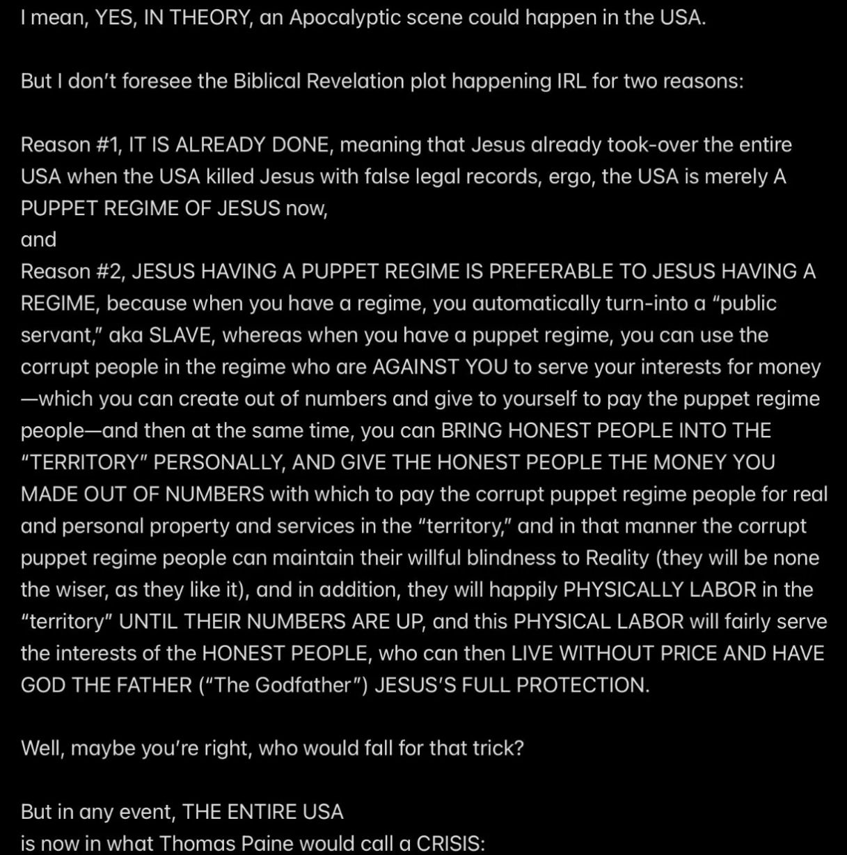 And that’s fine, and in fact it gives us all the more reason to BEWARE OF FALSE PROPHETS, because once we figure-out that God is creating hearsay about the murder-torture of God, then that smacks of A LEGAL TEST that we want to PASS, not flunk, and “pointing the finger at God” and crying “UNFAIR!”—trying to CENSOR OR CENSURE GOD—is not going to get us anywhere!